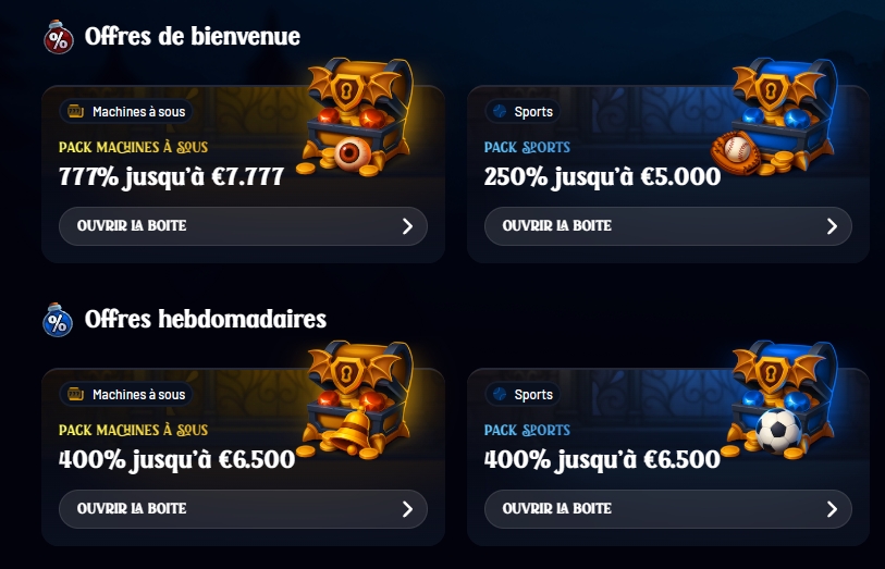 Dès l’inscription, Dracula Casino frappe fort avec un bonus de bienvenue pouvant atteindre 7 777 €, soit un taux de 777 % réparti sur les cinq premiers dépôts. Ce généreux package attire les nouveaux venus désireux d’augmenter leur bankroll et de prolonger leurs sessions de jeu. Pour en profiter, il suffit d’un dépôt minimum fixé à 20 €, une condition assez courante parmi les casinos en ligne présents sur le marché européen.
