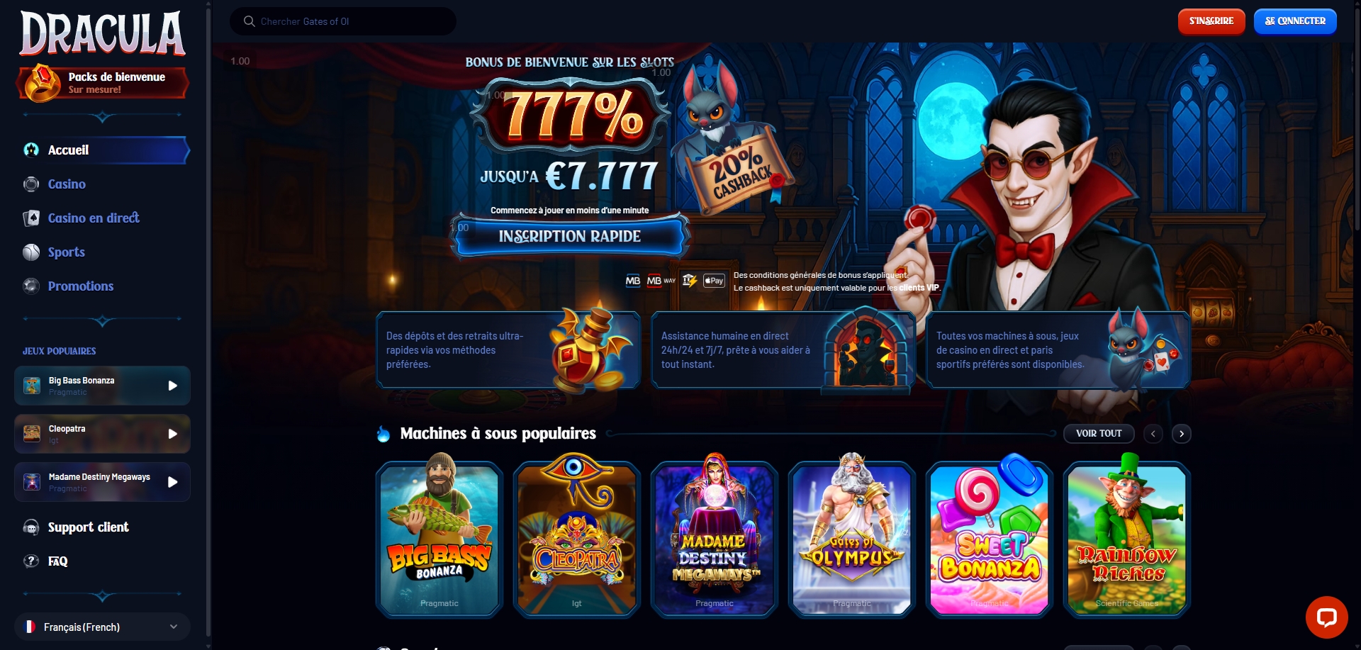 Il est facile de prendre contact avec le support Dracula Casino, disponible en continu via chat en direct. L’équipe est joignable 24h/24 et 7j/7 pour accompagner et répondre à toutes vos questions. Les échanges sont généralement fluides, et les réponses arrivent rapidement, un vrai gage de fiabilité lorsqu’il s’agit de résoudre un souci technique ou administratif.