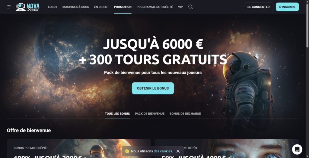 Niveau promotions, Nova Dreams met les bouchées doubles. Le pack de bienvenue, particulièrement généreux, donne droit jusqu’à 6000 euros accompagnés de 300 tours gratuits, répartis sur plusieurs dépôts.