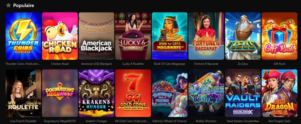 Du côté des catégories, le choix couvre toutes les envies : machines à sous dernier cri, jeux de table populaires (roulette, blackjack, poker), jackpots progressifs, cartes à gratter, ainsi que paris sportifs et e-sport. Le casino propose également une section dédiée au live dealer, portée par des leaders technologiques offrant des sessions animées en direct, recréant à merveille l’ambiance authentique d’un établissement physique.